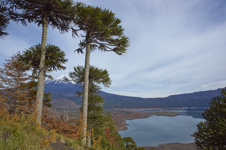 View of the volcano Lonquimay in the Araucan?a region of Chile through one of the oldest tree species: the Araucaria.
