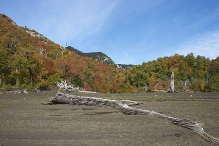 Conguillio National Park in southern Chile. Lake shore of Lago Conguillio surrounded by autumn trees.