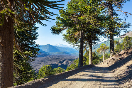 Road to Lake Tromen crossing a Araucaria forest in the south of the Province of Neuquen in Argentine Patagonia.