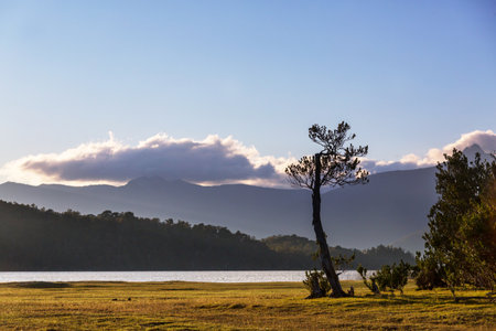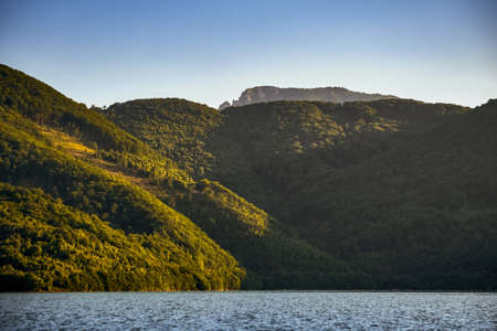 A sea surrounded by hills covered in forests under the sunlight and a blue sky