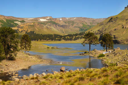 Blue and green lagoon with mountains at the back and pehuen trees in Caviahue, Neuquén, Argentina