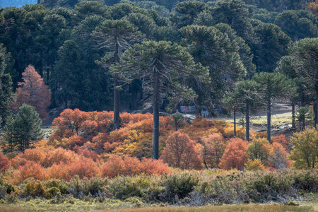 Autumn in Conguillio National Park in southern Chile. Trees in autumn foliage in the foreground; evergreen Araucania Trees (Araucaria araucana) beyond on the higher rocky mountain tops.