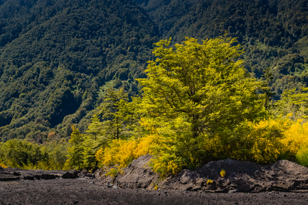 Trees covered in colourful autumn foliage rising out of the lava fields in Conguillio National Park in the Araucania region of Chile