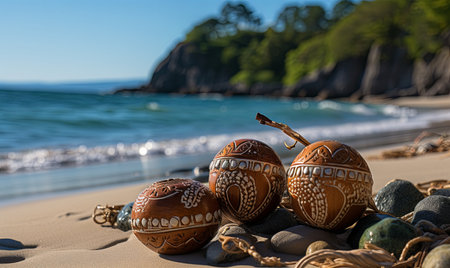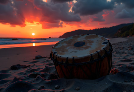 A tranquil beach scene features wooden drums placed on the sand, with gentle waves and lush palm trees creating a serene atmosphere during sunset.