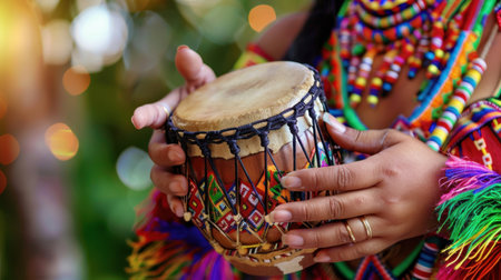 Hands skillfully beat a djembe drum, adorned in vibrant African attire, against a warm, dark backdrop.