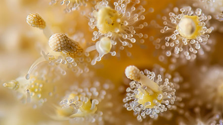 Close-up of delicate coral polyps showcasing their intricate details and vibrant colors underwater. Created with Generative AI