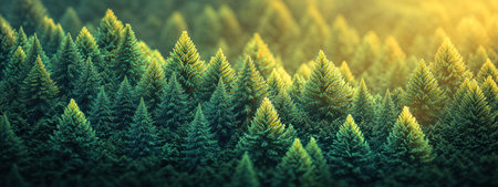 A serene view of dense evergreen forest bathed in warm sunlight, showcasing vibrant green foliage and tranquil natural atmosphere
