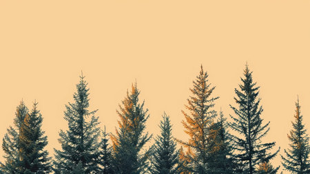Majestic pine trees stretch toward the sky, bathed in the warm glow of early sunlight. Hues of green intermingle with golden leaves, marking the transition into fall. A tranquil moment in nature.