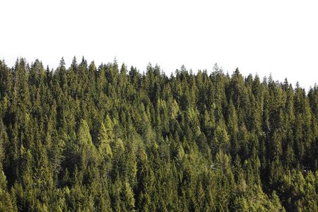 Background of green trees, slope of a mountain with fir trees in the sunlight.