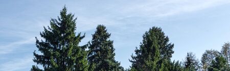 Low angle view of fir trees with blue sky at background, panoramic shot
