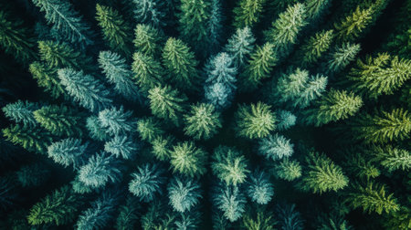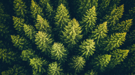 An overhead view reveals a dense forest canopy composed of numerous tall evergreen trees. The scene showcases a variety of green hues, with textures of needles and branches. The composition is framed by subdued lighting. The image suits commercial and editorial applications to depict nature or environment.