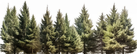 A tranquil winter landscape with a row of frosty trees in a snowy forest on a white background is AI Generative.