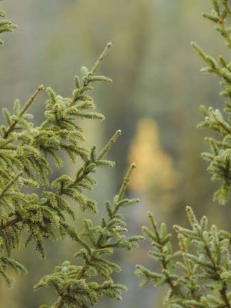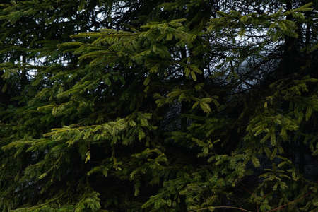 Green spiky branches of fur or pine in a coniferous forest, with place for text.