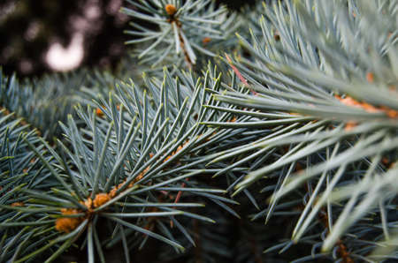 young branches of blue spruce with small buds of cones close-up texture for decor and design