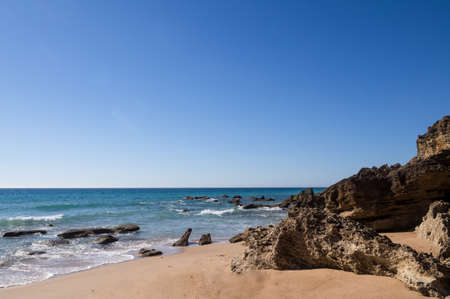 Rocky stone on beach at sunny day, Atlantic ocean coast, Adraga, Portugal. Travel and business background