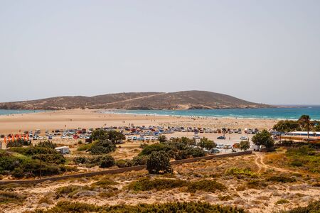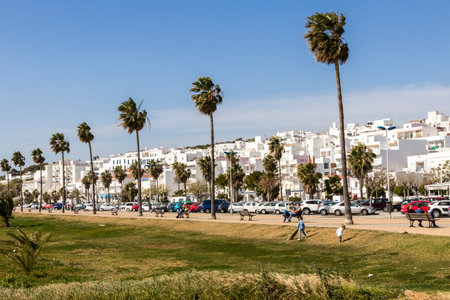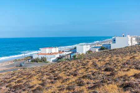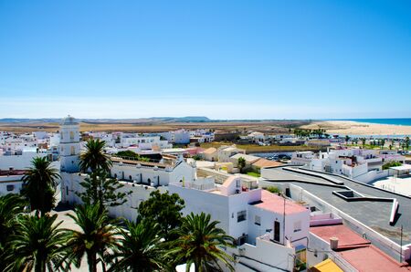 Conil de la frontera, Andalucia, April 21, 2017: Panoramic view of white buildings of the town, very typical for this area. In the background beach and mediterranean sea.