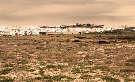White village of Conil de la Frontera located in the Spanish province of Cadiz we see it from the beach on a cloudy day