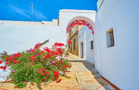 The arch of Abades viewpoint with lush blooming bougainvillea bush and bright pink flowers aginst the white wall, Arcos, Spain