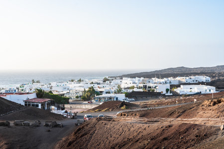 A coastal village El Golfo with white buildings offers serene ocean views against a rugged landscape in Lanzarote