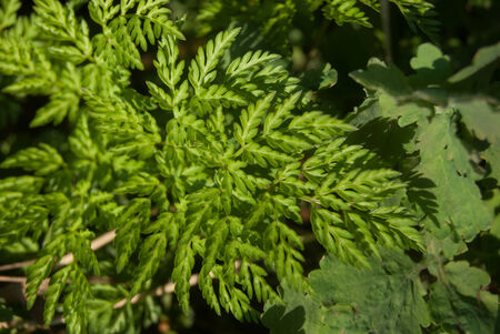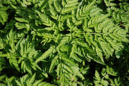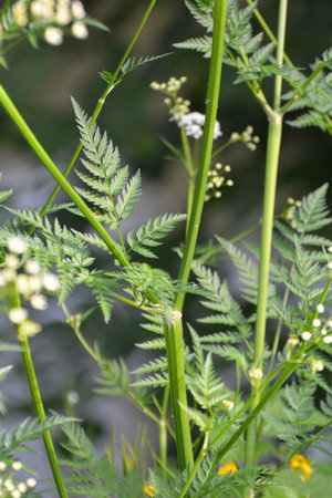 Botanical collection, myrrh chervil or myrrhis odorata medicinal plant in summer