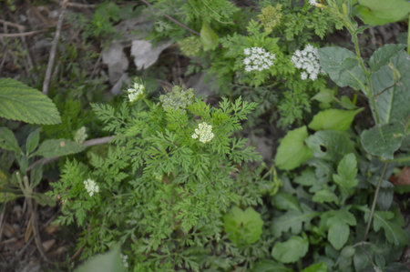 white inflorescence and green leaves of Aethusa cynapium plant.