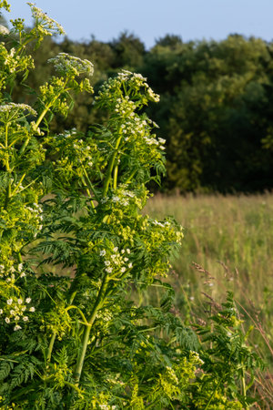 Conium maculatum hemlock toxic plant with small white flowers forming umbels light by flash