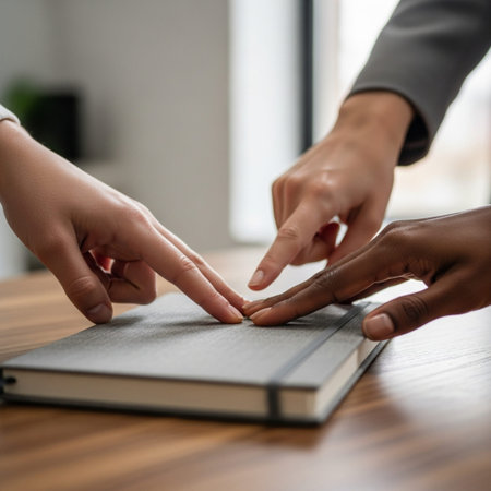 A Diverse hands placed together on table, symbolizing teamwork and unity