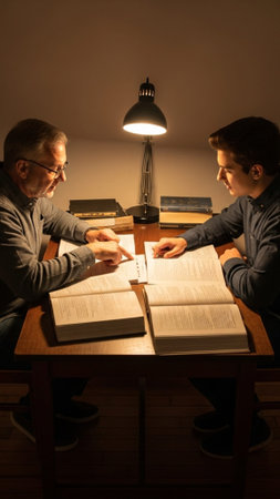 A high-angle view of a Bible study session. Two individuals discuss scripture with open books on a wooden desk, one gesturing with their hands to explain a point.
