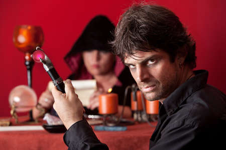 Male fortune teller with candle at table