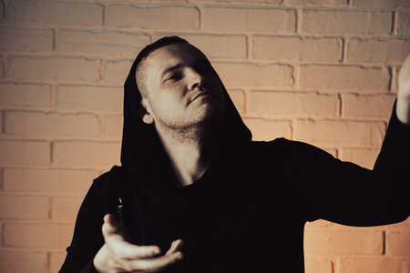 A man wearing a black hoodie is energetically dancing with expressive hand movements in front of a white brick wall.
