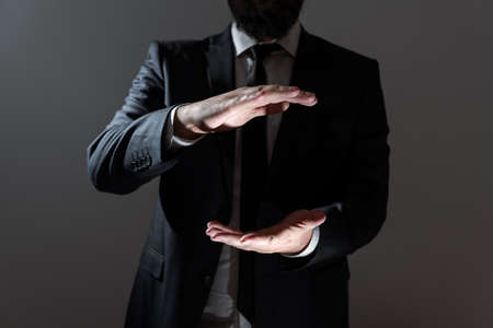 Businessman Holding Important Message Between Hands. Man In Suit Presenting Crutial Informations Among Palms. Executive Showing Recent Announcements. New Ideas Displayed.