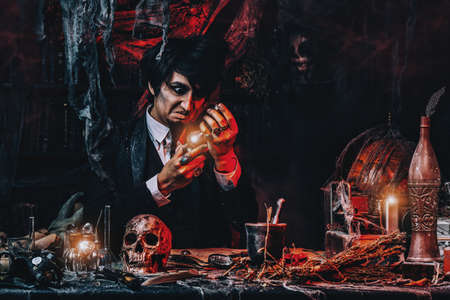 Portrait of a crazy alchemist's. The medieval scientist in his laboratory received the elixir of eternity of youth and longevity. Halloween
