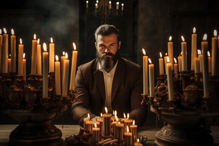 Thoughtful mature man in a dark room with burning candles.