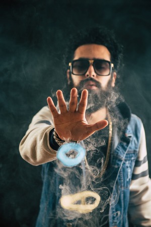 Smoking vape vaping man holding a mod. Vape color rings. A man throws smoke-colored rings. Tricks with smoke.