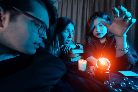 Group of people and woman fortune teller with crystal ball