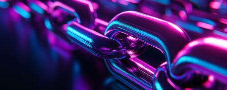 Close-up of metallic chain with neon lighting, futuristic background. Technology and connectivity concept