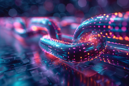 This image captures an abstract representation of a digital chain link, showcasing vibrant neon colors that symbolize connectivity and modern technology.