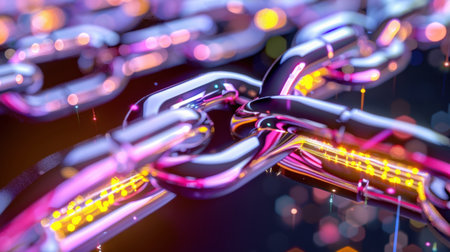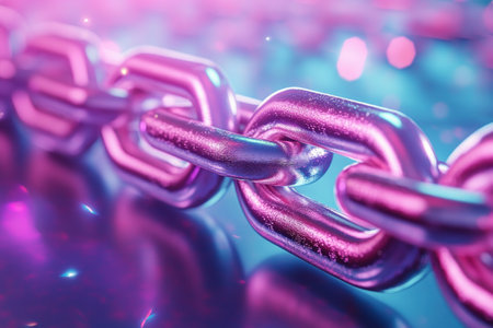 This captivating image showcases interlocking chain links with a shiny and colorful surface, reflecting light in an abstract and modern style. The composition highlights strength and connection, making it ideal for themes of security and technology.
