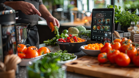 A vibrant kitchen scene featuring fresh vegetables, herbs, a recipe app on a tablet, and modern cooking tools, showcasing a dedication to healthy meal preparation and culinary innovation.