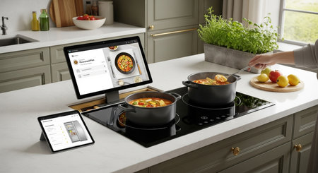 A sleek kitchen showcases smart appliances that enhance cooking efficiency, offering connectivity options and user-friendly features.