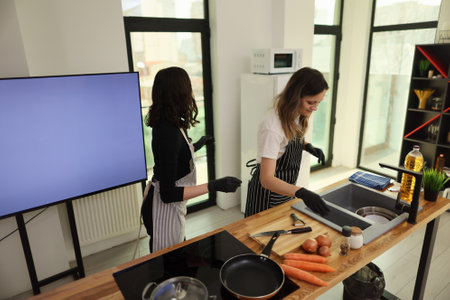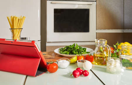 Foods to cook from the digital recipe virtual online master class tutorial using touch tablet while cooking healthy food in the kitchen at home.