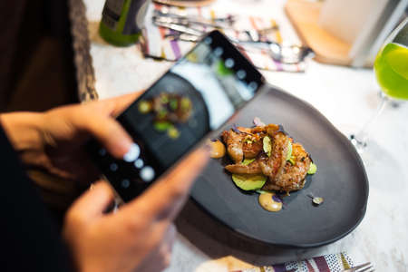 Taking photo with smart phone of food in restaurant, take photo with mobile phone.