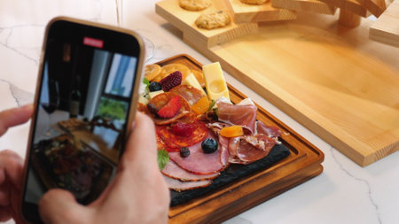 Taking Smartphone Photo of Delicious Charcuterie Board with Assorted