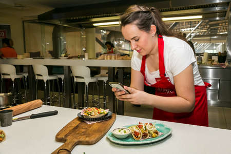 Chef taking a photo of lunch with smartphone