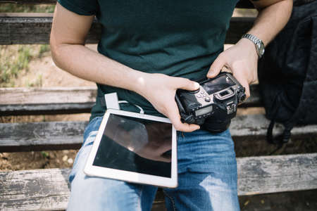 Close-up view of male hand holding professional camera. Cropped male photographer uploads photos to tablet while holding camera outdoor.