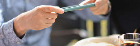 Cafe visitor photographs his lunch with smartphone. Food blogger review at bistro concept