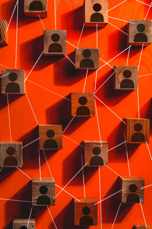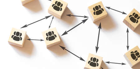 Wooden blocks with human icons connected by lines represent social networks, communication, and teamwork on a blue background.