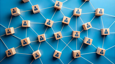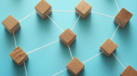 A close-up view of interconnected wooden cubes, signifying the concept of networks, connections, and collaboration on a smooth blue surface. The simple design emphasizes the importance of interconnected systems in today's globalized world.