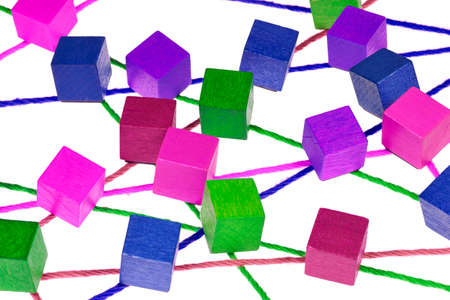 Colorful wool threads form a network between colorful cubes