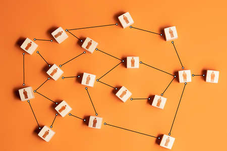 Network of connected staff blocks figurines by line. Unconventional company structure, distribution responsibilities between employees. High autonomy. Atypical hierarchical business system.